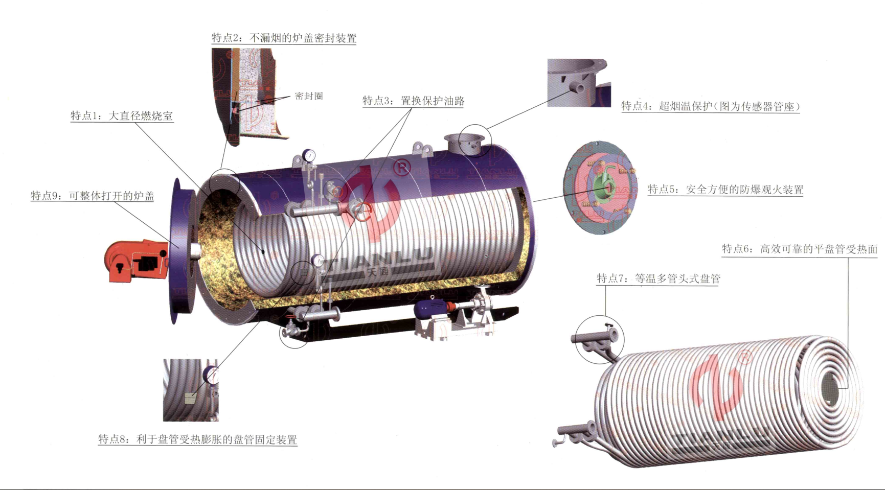 有機熱載體爐是以導熱油為熱載體,利用循環泵強制液相循環將熱能輸送給用熱設備,換熱后繼續返回加熱爐再加熱的直流式特種工業爐,有著其它工業爐不能比擬的工藝特點。天鹿牌有機熱載體爐是由以導熱油為介質臥式三回程帶底盤管的有機熱載體爐,它由兩組圓柱形盤管、底盤管、爐殼、前煙箱門、底座、保溫層、外包組成。有機熱載體爐配有燃燒機、自控系統、熱油循環泵、空氣預熱器、節能器、儲油槽、膨脹槽等輔機和閥門儀表。