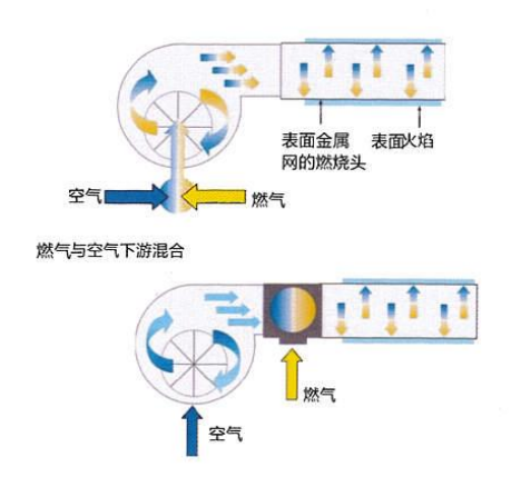 通過特殊設計的燃燒機及混合裝置,在點火之前將燃氣與空氣完全混合均勻,并送入特制的燃燒頭(金屬圓柱網)進行燃燒,火焰只在燃燒頭的表面燃燒,燃燒溫度低,從而有效減小NOx生成。