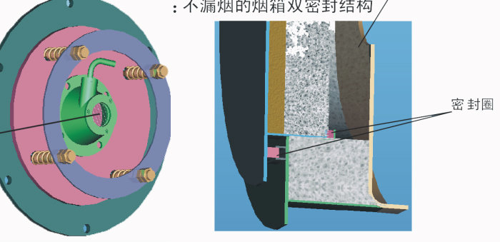 煙箱門采用迷宮式密封結構不漏煙(如圖),鍋爐保溫層采用100mm的硅酸鎂纖維毯、復合硅酸鹽保溫涂料和防水涂料,確保體散熱損失降到最低,爐表溫度≤40℃,最大限度提高鍋爐效率。