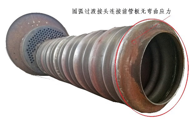 圓弧過渡接頭連接爐膽和前管板具有很好的熱伸縮性能,有效吸收熱膨脹,無彎曲應力。